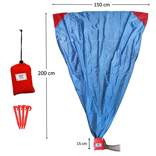 Das Material dieser wasserdichten Stranddecke ist atmungsaktiv und trocknet sehr schnell. Der Sand vom Strand lässt sich mühelos abschütteln und dringt nicht ein. Ein weiterer Pluspunkt dieser wasserdichten Stranddecke ist das niedrige Gewicht von gerade einmal circa 235 Gramm. Zusätzlich verfügt sie in jeder Ecke über eine Sandtasche, in der Sand oder Steine zur Befestigung gelegt/gefüllt werden können.