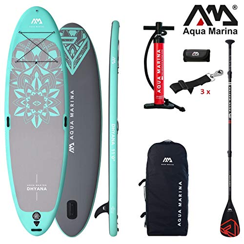 Das Aqua Marina Dhyana ist in unterschiedlichen Sets erhältlich, die sich in Umfang und Art des enthaltenen Zubehörs unterscheiden. Das hellblaue Board wiegt weniger als 10 Kilogramm, misst 336 cm x 91 cm (Länge x Breite) und ist 12 cm dick. Das Board verfügt über drei Trageschlaufen, ein Gepäcknetz und jeweils über einen D-Ring an Bug und Heck für das Befestigen eines Leashs.